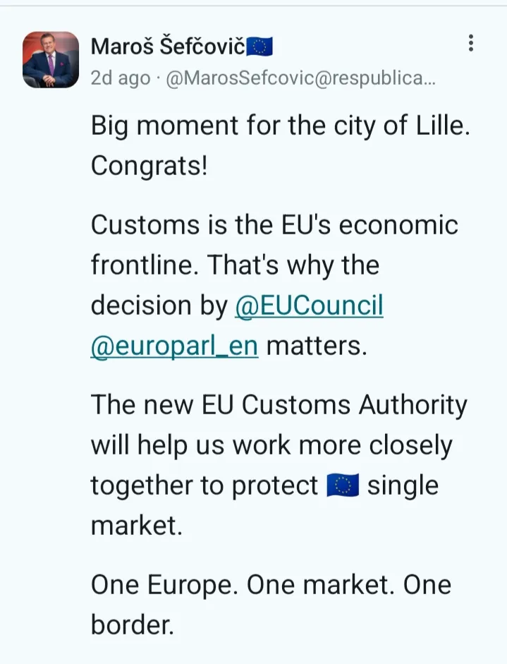 On Mastodon, EU Trade Commissioner Maroš Sefčovič congratulated Lille on being chosen as headquarters for the new ECA…