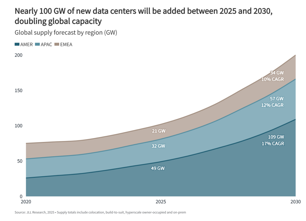 Nearly 100 GW of new data centres will be added between 2026 and 2030, doubling global capacity, according to JLL, a real estate services and investment management company. The global data centre sector will likely expand at a 14% CAGR through 2030, the firm said in its 2026 Global Data Center Outlook report.